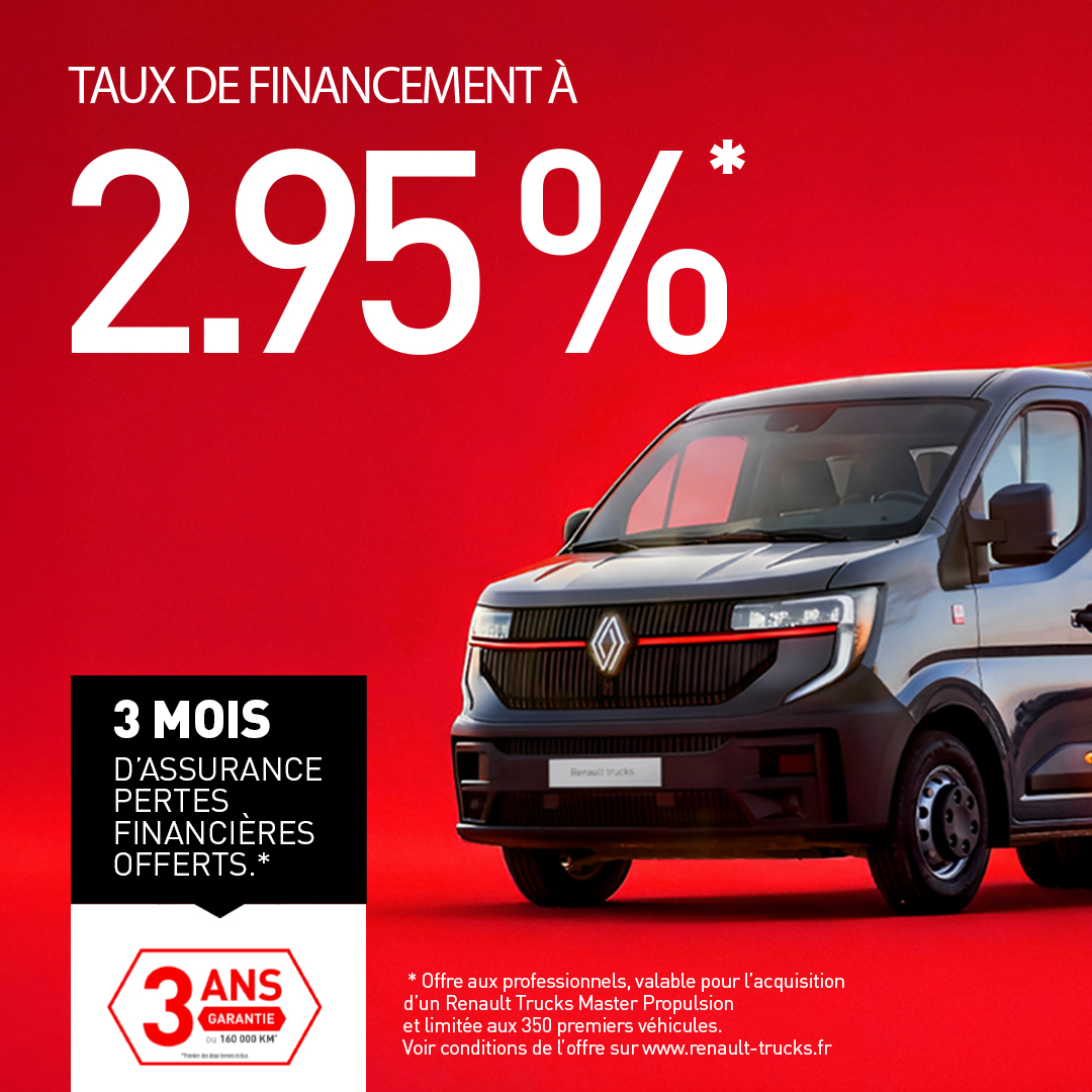 Cette offre est réservée aux professionnels, valable pour l’acquisition d’un Renault Trucks Master Propulsion et limitée aux 350 premiers véhicules.